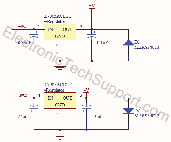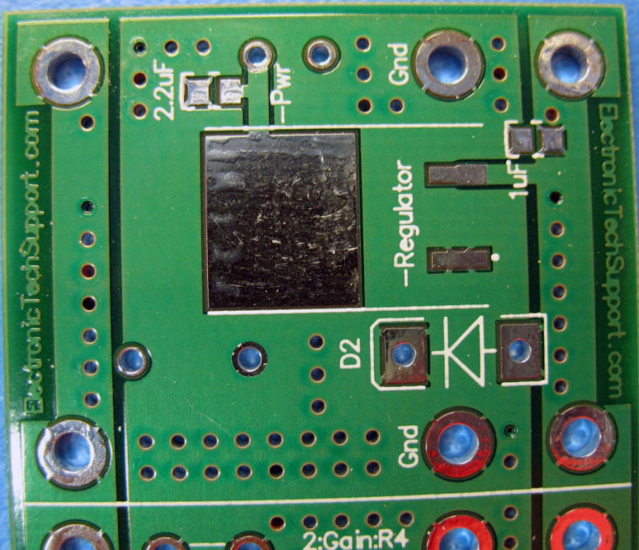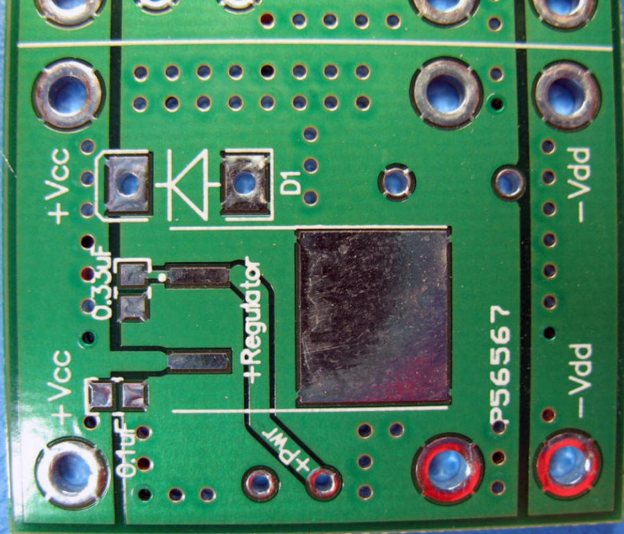 pads for optional 4.7uF capacitors (C5 & C6) on + and - Voltage